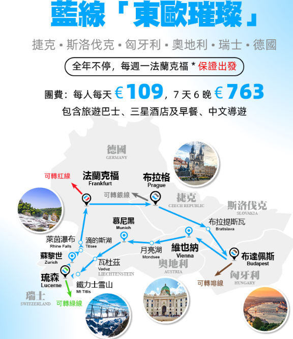 本線路可以提供延住的城市有:法蘭克福、布拉格、布達佩斯、維也納