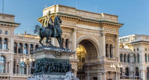 埃马努埃莱二世长廊是一个带顶棚的拱廊街,得名于意大利统一后的国王埃马努埃莱二世,这里被认为是欧洲非常美的商业拱廊之一。拱廊是设计师仿照巴黎古典商业拱廊而建的,两条交叉的长廊呈十字型,南北长198米,东西长105米,两条玻璃拱顶的走廊交汇于中部的八角形空间,上方是一个玻璃圆顶。阳光透过玻璃屋顶,照射在底下精致的浮雕和壁画上,泛着神圣的金色光芒。