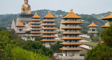 佛光山这座庄严肃穆的寺院最令人印象深刻的非「大佛城」莫属,端庄雄伟的大佛金像高达120公尺,面向日出东方,俯瞰高屏溪水,是东南亚最高的立佛。周围环绕着480尊较小的接引佛像,给人千佛护持的肃穆感,参观过的游客都会为这庄严恢宏的气度留下深刻印象。