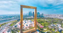 “迪拜之框”始建于2013年,高度约150米,宽93米。令人称奇的是其外表将全部贴金,总造价高达1.6亿迪拉姆(约合3亿人民币)。这个150米高的镀金框架高调地立于扎比尔公园之上,顶端设有93米的观景天桥,观景天桥提供了360度的全景视野,向人们呈现了这座城市的历史风景与现代建筑。