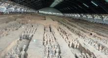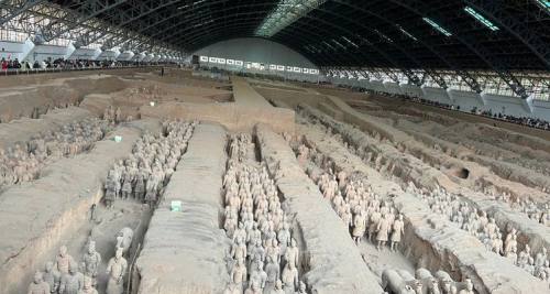 秦始皇兵马俑博物馆又称兵马俑、秦兵马俑。它是秦始皇陵的陪葬坑,与秦始皇帝陵一同组成了:秦始皇帝陵博物院。这里出土的一千多个士兵陶俑,形象各不相同,神态生动,是中国古代雕塑艺术史上的一颗璀璨明珠,被誉为“二十世纪考古史上的伟大发现之一”。景区中的一号俑坑是较早发掘出来的。俑坑东西长约230米,南北宽约62米。根据试掘已出土陶俑、陶马的排列密度推算,一号兵马俑坑内约埋藏陶俑、陶马六千件,同时还有大量的青铜兵器。一号坑也是目前拼凑完成较令人震撼的一个展厅,你可以看到庞大的士兵陶俑军队矗立在俑坑内,形态各异,据说光是胡子的造型就有三十多种。仔细观察,每一个士兵都栩栩如生,从盔甲到表情,从武器到手掌上的纹路,无一不令人惊叹。二号坑和三号坑分别在一号坑的两旁。和一号坑一样有真人、真马大小相似的陶俑、陶马近二千件。有车兵、骑兵和步兵等不同的兵种,排列整齐有序。