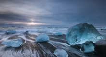 钻石冰沙滩位于冰岛东南部,临近杰古沙龙冰川湖。因冰湖水量很大,湖内的许多冰块便会随潮水被冲击到黑色的沙滩上。这些碎冰块曾在水中浸泡,棱角经过水流的雕琢打磨,像钻石一般晶莹剔透,从而形成这里独特的景观。每至夕阳西下的时候,黑色的沙滩上,晶莹的冰块在斜阳的余晖照耀下更显剔透,给人一种迷人而梦幻的感觉。