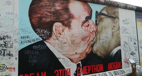 当年,东德为筑起这堵柏林墙,耗费了大量的人力、物力和财力。如今,残留的柏林墙上有来自于全世界181位画家的漫画创作,较为醒目的一幅是昂纳克和勃列日涅夫接吻的镜头。