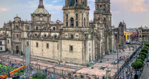 宪法广场之于墨西哥城就如同埃菲尔铁塔于巴黎,斗兽场之于罗马,是去墨西哥城必到的地方,也是墨西哥的心脏地带,是西班牙殖民者摧毁了阿兹特克帝国的都城特诺奇蒂特兰后重建的。这里一直非常热闹,不论是在16世纪(在废墟上建起的),还是在18世纪(摊贩云集的市场),即使是在已经成为政府机关所在地的今天,热闹从未停止。广场前方就是主座教堂和大神庙遗址,大神庙(Templo Mayor)兴建于当时广场的中央。西班牙人抵达之后,摧毁了这座大神庙,并在上方建造了主教座堂(Catedral Metropolitana),因此好几百年的文明历史和西班牙人抵达前的这座重要的大神庙就这样被埋没遗忘。1970年代末期,电缆公司的工人施工时,意外挖掘到这座大神庙的建筑结构,考古学家们开始寻找这座大神庙的遗迹。
