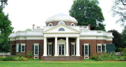 杰斐逊故居又称蒙蒂塞洛庄园,是美国前总统托马斯・杰斐逊的故居,一栋罗马新古典主义建筑。这座举世闻名的庄园位于一座小山顶端,外围绿树葱郁,并有碧波一潭,深秋时节,树叶则如一组色阶,错落出由红至黄的各种色彩。杰斐逊故居无论是感觉和视觉,都给人一种浑然天成之感。庄园的主建筑采用多利安式的门廊、白色的圆顶以及低矮的红砖为主体的搭配,配合着周边的碧草、红叶、蓝天,充分体现了杰斐逊富有诗意的想象力。