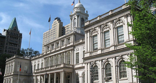 纽约市政厅坐落于曼哈顿下城市政中心区的市政厅公园中央,它是美国最老的仍在使用的市政厅。1966年被收录至美国国家史迹名录,成为美国国家历史建筑。它的圆形大厅也是纽约市的地标之一。