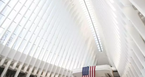 飞鸟车站坐落于纽约新世贸中心旁,从外形上看,它仿佛一只振翅飞翔的和平鸽,西班牙设计师从一幅儿童放飞和平鸽的图中所得的灵感。走进飞鸟车站,阳光透过整齐一排的白色支架照射进来,让人感受充足的明亮与希望。飞鸟车站在众多现代建筑中脱颖而出的不仅仅是建筑本身,它还是一个集合美食与购物的广场。