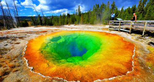 又称七彩池,是美国第一、世界第三大温泉,宽度75-91米,深达49米,每分钟会涌出大约2000升71度的热水。大棱镜温泉的令人惊叹之处在于湖面的颜色会随季节而改变。春天的时候湖面从翠绿色变为金灿灿的橙红色,这是由于富含矿物质的水体中生活着的藻类和含色素的细菌等微生物。盛夏时节,叶绿素含量相对较低,因此湖水呈现出绚烂的橙色、红色或黄色。但到了数九寒冬,由于缺乏光照,这些微生物就会产生更多的叶绿素来抑制类胡萝卜素的颜色,于是就看到水体呈现深邃的墨绿色。