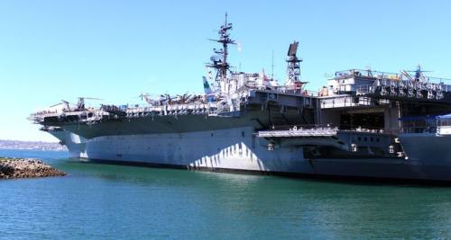 一艘曾经战功赫赫的退役航空母舰,现在永久地停泊在圣地亚哥商业区海滨,开放参观。这艘巨船的甲板上停满了二战至沙漠风暴行动期间使用的战斗机,游客不仅可以观看,还可以登上飞机参观机身内部。其它互动展品包括身临其境聆听军事飞行员之间的对话录音,以及乘坐飞行仿真器。