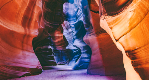 下羚羊彩穴位于美国亚利桑纳州北方,是柔软的砂岩经过百万年的各种侵蚀力所形成。季风季节里常出现暴洪流入峡谷中,由于突然暴增的雨量,造成暴洪的流速相当快,加上狭窄通道将河道缩小,因此垂直侵蚀力也相对变大,形成了下羚羊彩穴底部的走廊,以及谷壁上坚硬光滑、如同流水般的边缘。下羚羊彩穴中没有任何人工照明,所有可见的光线均来自于峡谷顶部的裂缝,这些光线经过岩石纹理的反复折射 进入谷底,产生出梦幻般不规则的色彩变化,这些色彩由深至浅,七彩斑斓,美轮美奂。