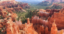 布莱斯峡谷国家公园位于美国犹他州西南部,其名字虽有峡谷一词,但其并非真正的峡谷,而是沿着庞沙冈特高原东面,由侵蚀而成的巨大自然露天剧场。其独特的地理结构称为岩柱,由风、河流里的水与冰侵蚀和湖床的沉积岩组成。位于其内的红色、橙色与白色的岩石形成了奇特的自然景观,因此其被誉为天然石俑的殿堂。